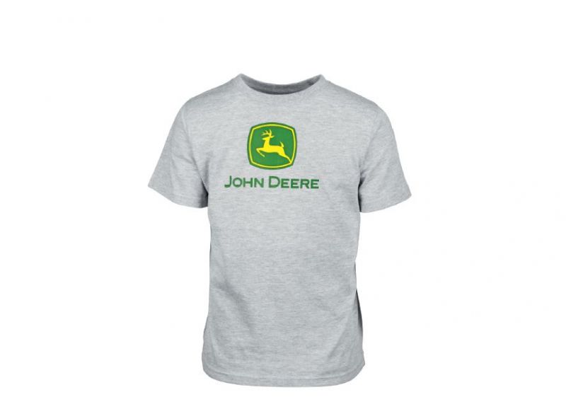 Šedé dětské tričko John Deere se sítotiskem loga značky na přední straně. Materiál: 60% bavlna, 40% polyester