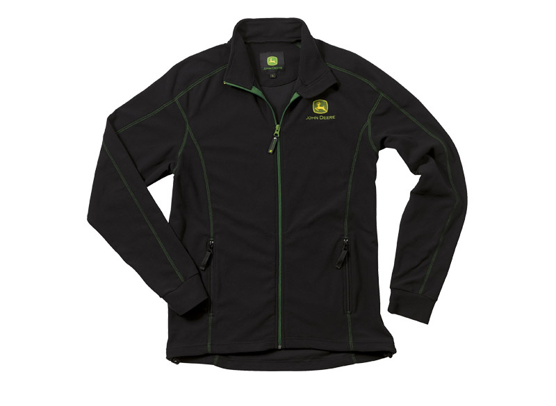 Mikrofleecová bunda John Deere v černé barvě, jejíž součástí jsou kontrastní švy. Na levém prsu je vyšité barevné logo John Deere. Bunda je lehká a teplá.