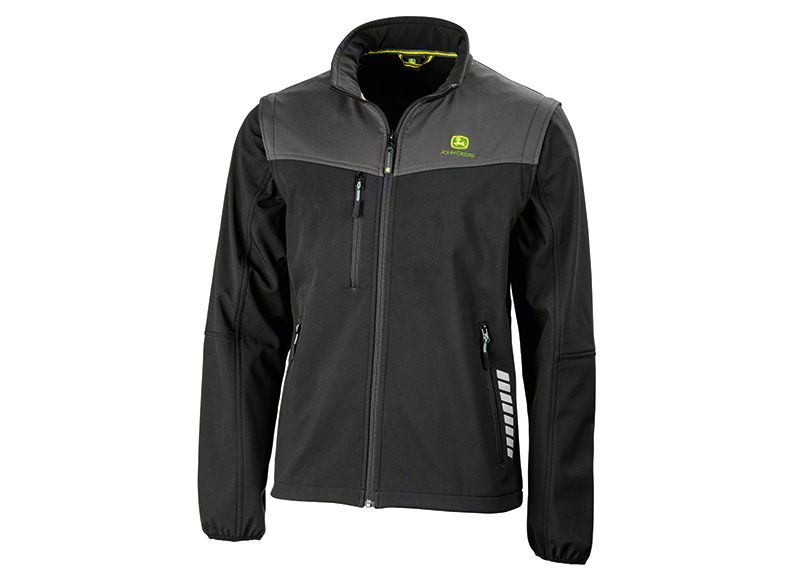 Pánská softshellová bunda se čtyřmi vnějšími kapsami a jednou vnitřní. Bunda má rukávy vyrobené z hrubé látky. Malé John Deere logo je našité na hrudi.