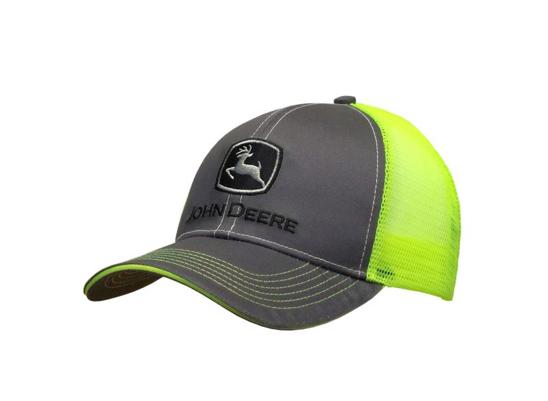 Šedozelená kšiltovka John Deere se šedým kšiltem a vyšívaným logem na přední straně. Přední část je vyrobena ze 100% bavlny, zadní část ze 100% polyesterové síťoviny.