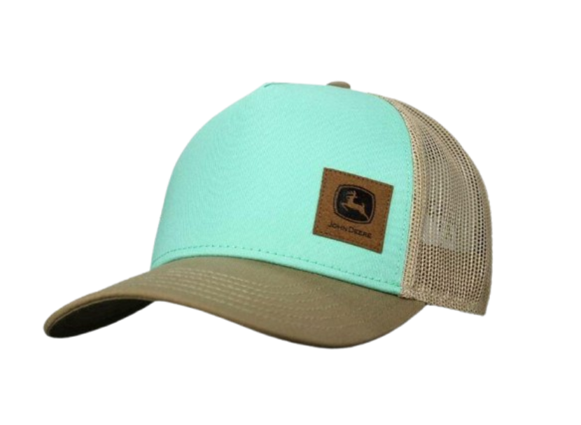 Síťovaná čepice John Deere s nášivkou z umělé kůže na levém předním panelu s logem John Deere.