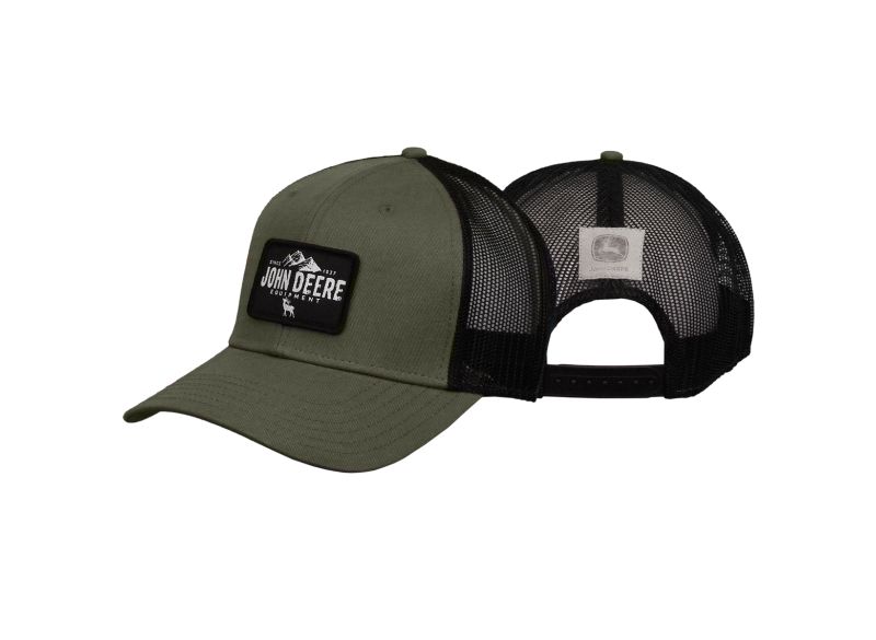 Olivově zelená kšiltovka John Deere s nášivkou loga na přední straně. Přední část je vyrobena ze 100% bavlny, zadní část ze 100% polyesterové síťoviny.