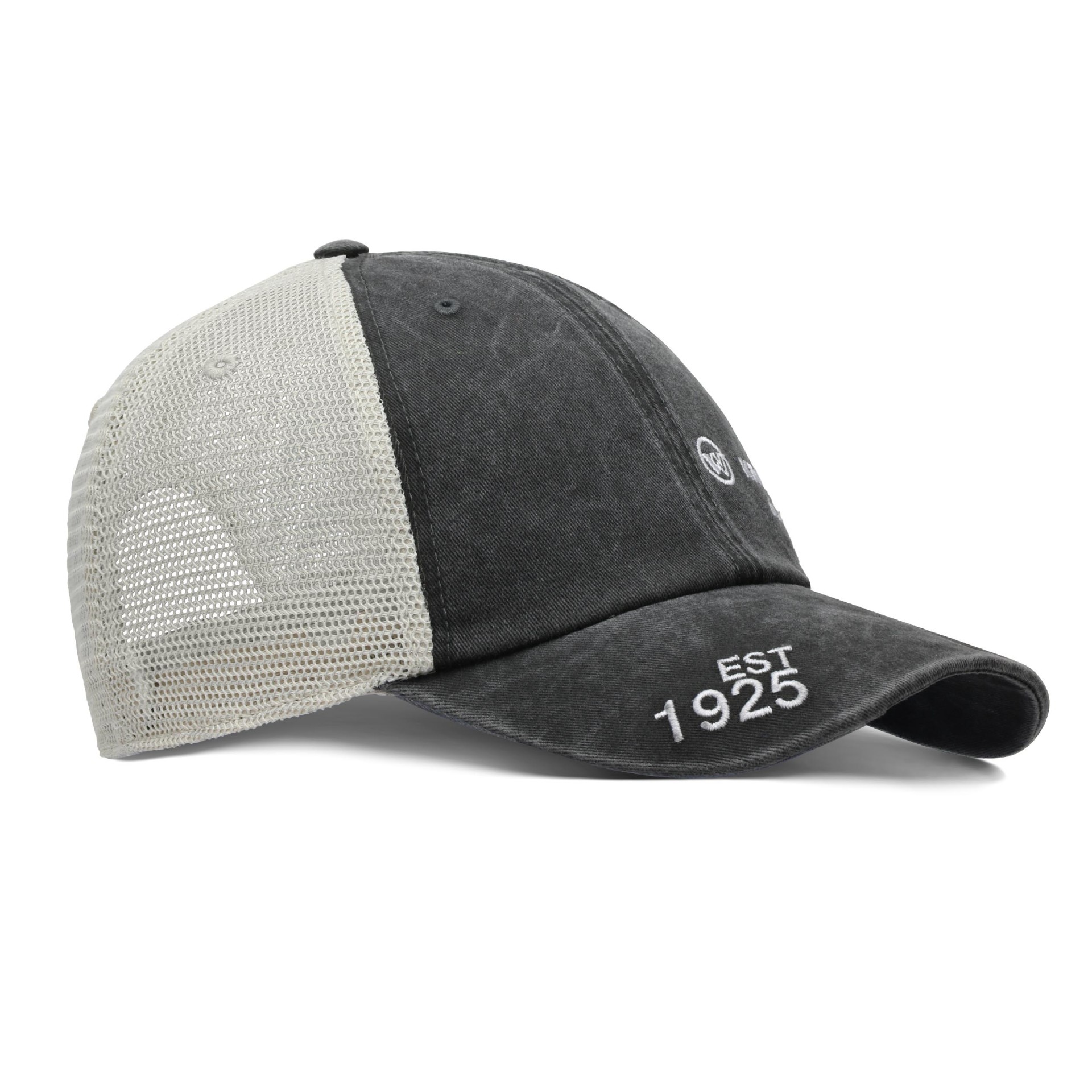 Vintage kšiltovka John Deere v černo‑bílé kombinaci s logem na přední straně. Přední část je vyrobena ze 100% bavlny, zadní část ze 100% polyesterové síťoviny.