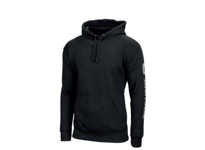 Černá fleecová mikina John Deere s kapucí a sítotiskem loga na přední straně. Materiál: 60% bavlna, 40% polyester