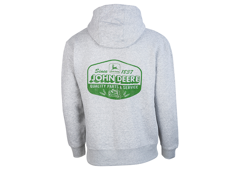 John Deere mikina námořnicky modré barvy s kapucí se sítotiskem vintage loga na levé straně hrudi a vintage nápisem "Parts and Service" uprostřed...