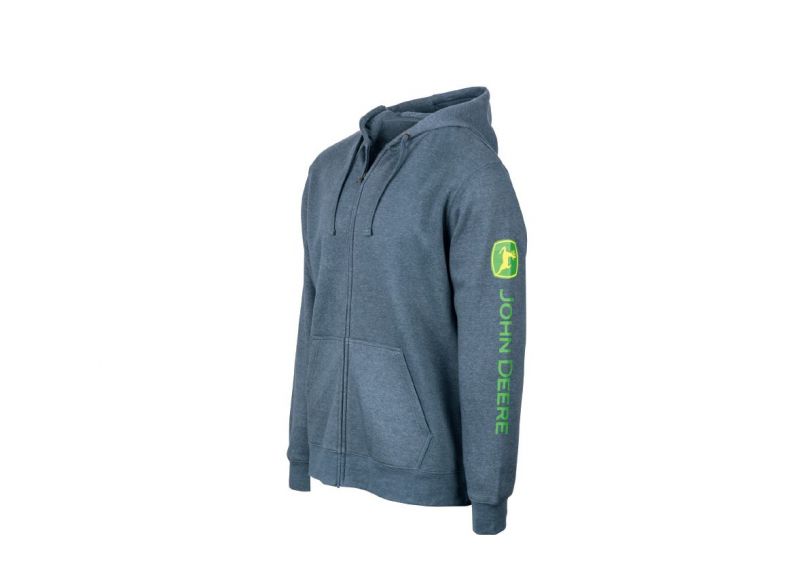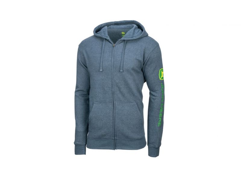 John Deere námořnická fleecová mikina s kapucí se sítotiskem loga na levé straně hrudi a logem časové osy uprostřed zad. Materiál: 60% bavlna, 40% polyester