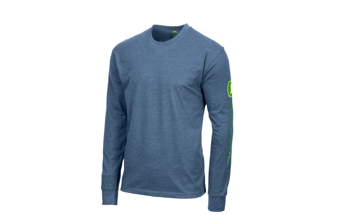 Zelené tričko John Deere s dlouhým rukávem se sítotiskem loga značky na rukávu. Materiál: 100% bavlna