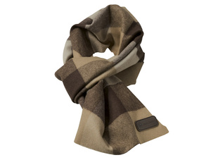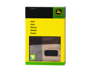 Hnědá kostkovaná šála John Deere "Country" s hnědou koženou nášivkou obdelníkového tvaru s nápisem John Deere.