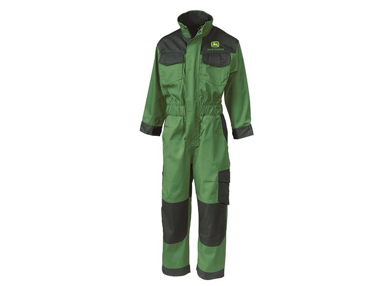 Klasický pracovní overal John Deere pro farmáře juniory s předním zapínáním na zip, náprsní kapsou s klopou, dvěma šikmými bočními kapsami a jednou zadní kapsou. Elastický pas....