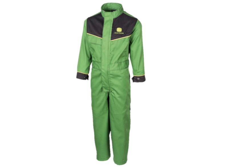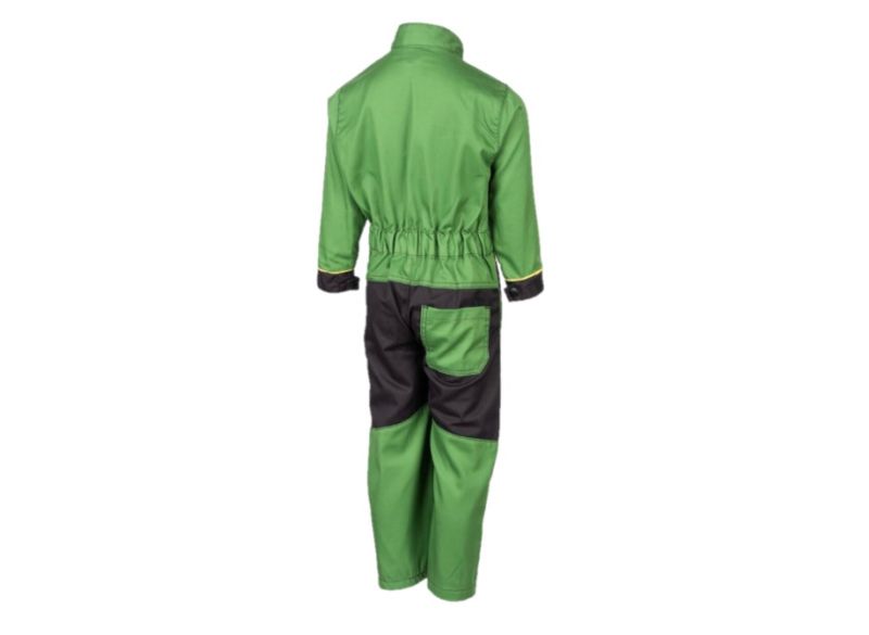 Klasický pracovní overal John Deere pro farmáře juniory s předním zapínáním na zip, náprsní kapsou s klopou, dvěma šikmými bočními kapsami a jednou zadní kapsou. Elastický pas. Kontrastní žluté lemování pro klasický vzhled v barevném stylu traktorů John Deere. Nastavitelné lemy rukávu se zapínáním na knoflíky.